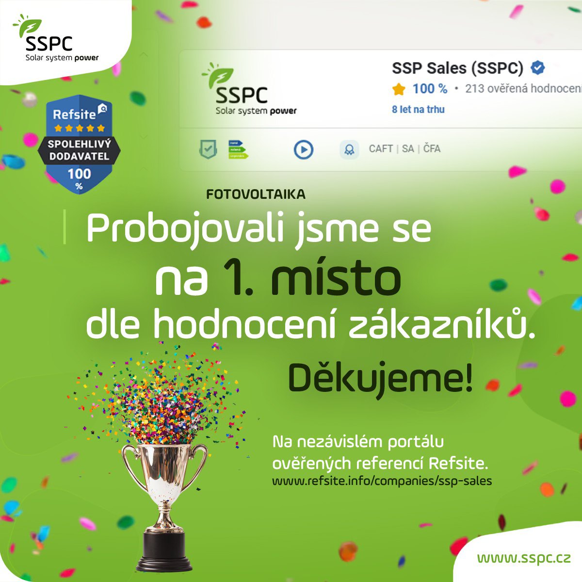 Díky neustálému úsilí našeho týmu i důvěře spokojených klientů se naše společnost drží na prvních pozicích v kategorii fotovoltaika na prestižním portálu Refsite.