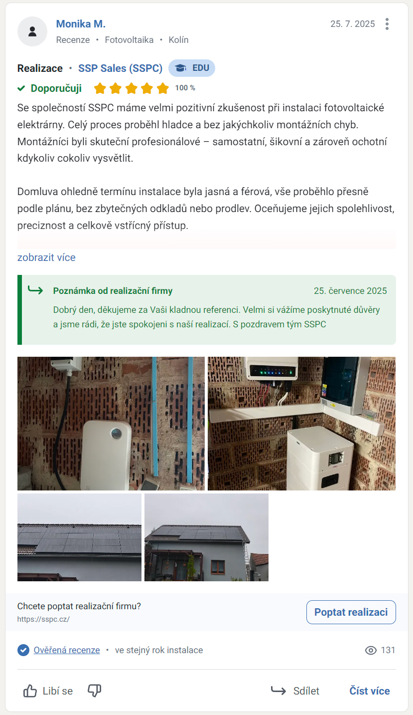 "Se společností SSPC máme velmi pozitivní zkušenost při instalaci fotovoltaické elektrárny. Celý proces proběhl hladce a bez jakýchkoliv montážních chyb. Montážníci byli skuteční profesionálové – samostatní, šikovní a zároveň ochotní kdykoliv cokoliv vysvětlit. Domluva ohledně termínu instalace byla jasná a férová, vše proběhlo přesně podle plánu, bez zbytečných odkladů nebo prodlev. Oceňujeme jejich spolehlivost, preciznost a celkově vstřícný přístup. Firmu SSPC můžeme s klidným svědomím doporučit každému, kdo hledá kvalitního a solidního dodavatele FVE."
